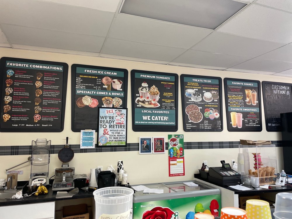 Fudge brownie, double toffee. Banana, 3 scoops of ice cream, peanuts, hot fudge, hot caramel, strawberry topping, whip cream, and cherries. Add-ons for an additional charge.